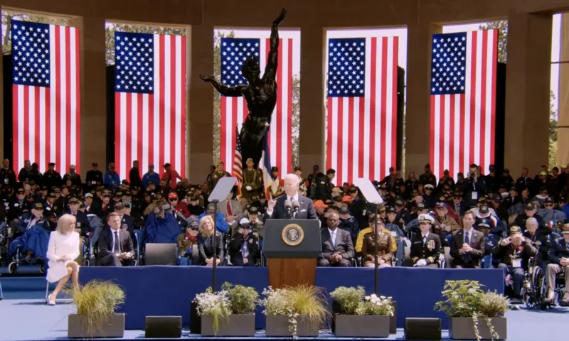 Biden a participat alături de omologul său francez Emmanuel Macron la o ceremonie franco-americană, la cimitirul american din Colleville-sur-Mer, ca parte a evenimentelor de comemorare a 80 de ani de la cel mai amplu asalt amfibiu din istorie, neegalat până în prezent, unde 150.000 de militari aliați, dintre care 73.000 americani, s-au îmbarcat cu destinația Normandia pentru a elibera Franța de sub ocupație nazistă și, mai departe, Europa de Vest. Președintele american Joe Biden efectuează cu această ocazie o vizită de stat în Franța, care coincide cu perioada alegerilor europene. În Normandia, Biden este prezent în calitate de al 12-lea și, cu siguranță, ultimul președinte american care a fost în viață în acea zi din 1944, având doar un an și jumătate atunci când soldații americani debarcau în Normandia.