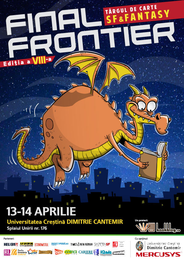 Scriitori români de SF&F care te provoacă la dezbateri fantastice, biblioteci pline de noutăți editoriale, ateliere în care explorezi lumi noi, figurine, VR, Booktubers, concursuri de cosplay și gaming pentru toți #DragoniiDeBibliotecă feroce – asta ți-am pregătit în week-end-ul 13-14 aprilie, la Final Frontier #8, Universitatea Creștină Dimitrie Cantemir (Splaiul Unirii nr. 176) între orele 11:00 și 19:00. Intrarea este liberă!