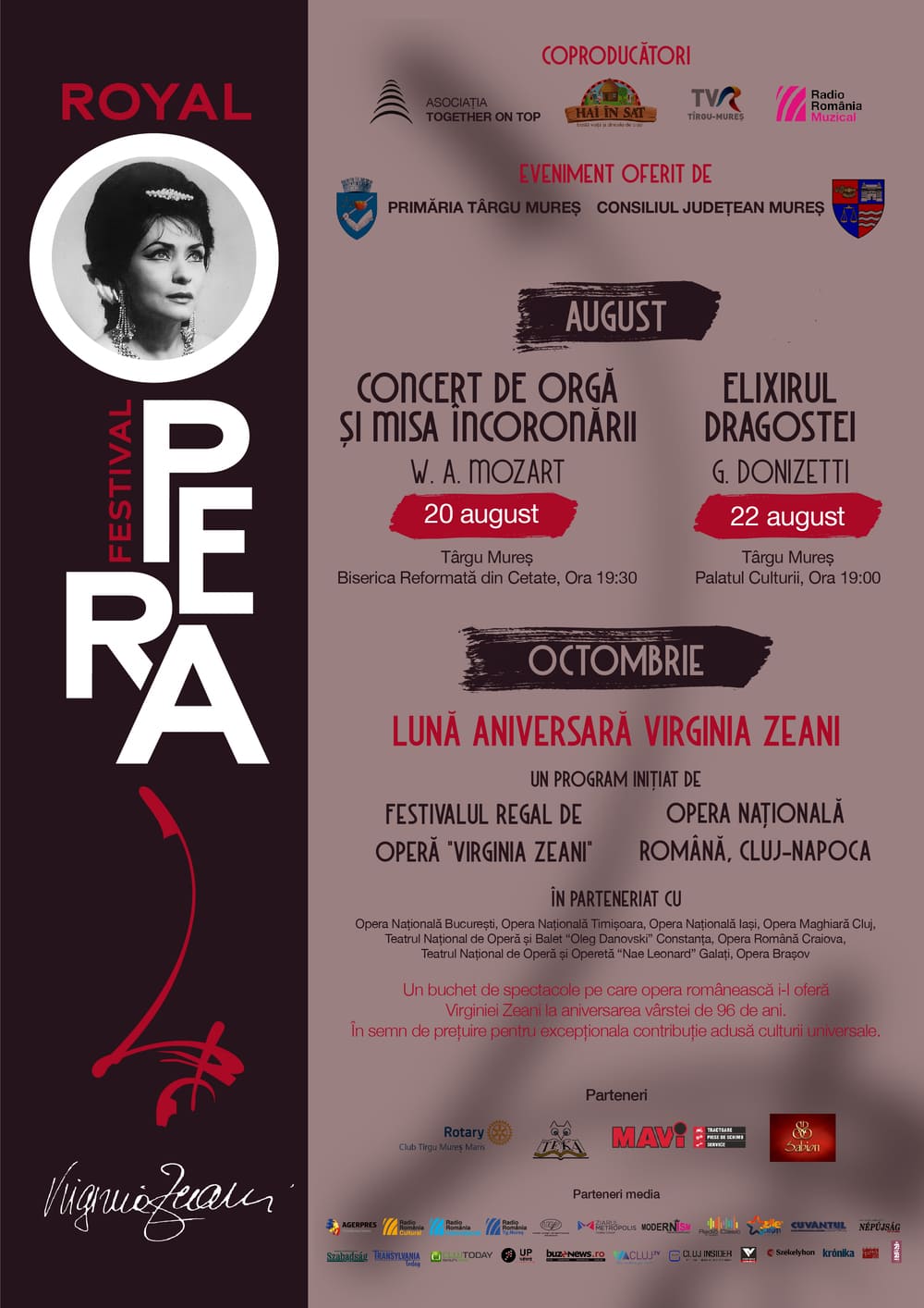 Festivalul Regal de Operă “Virginia Zeani” – patru ani de excelență la Târgu Mureș, Cluj-Napoca și Reghin. A fost L’Assoluta într-o vreme în care Maria Callas era „La Divina”, iar Renata Tebaldi își savura titlul de înger („L‘Angelo”) al muzicii culte italiene. Festivalul Regal de Operă este un omagiu adus Virginiei Zeani, al cărei parcurs artistic relevă un sublim model de viață și de conduită scenică. Vorbește despre valorile care au guvernat destinul unei tinere care, la vârsta de 13 ani, a pornit să-și înfrunte viața dintr-un sat transilvan, ajungând diva adorată a marilor teatre ale lumii. Pentru 30 de ani ”prima donna assoluta” a marilor scene internaționale și pentru tot atâta timp profesor emerit de muzică al Universității Indiana din Statele Unite, Virginia Zeani este un important reper al lumii culturale la nivel mondial și unul dintre cele mai puternice simboluri naționale ale României.