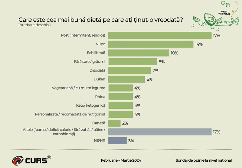 Sondajul indică o creștere semnificativă a aderării la regimuri alimentare echilibrate nutrițional, astfel că în anul 2023, 17% dintre români au declarat că au ținut dietă, iar ca opțiuni au preferat postul / intermitent sau religios (17%) și dieta Nupo (14%). Alte diete menționate sunt: regim echilibrat (10%); fără sare, grăsimi (8%); Dukan (6%), vegetariană/ cu multe legume (4%); Rina (4%), ketogenică (4%); personalizată/recomandată de nutriționist (4%); daneză (2%). În același timp, 17% dintre persoanele participante la studiu au avut răspunsuri legate de foame / deficit caloric / fără zahăr / pâine / carbohidrați.
